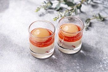 桃のクランベリーコンポートとマスカットゼリー ライチの泡をのせて