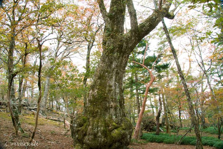 前述の展望所への道すがら、突如現れるのが、この根元部分がかぼちゃのような奇形ミズナラの巨木。まるで森の主のような風格と存在感です(周囲にはロープが張りめぐらされ立入禁止)。