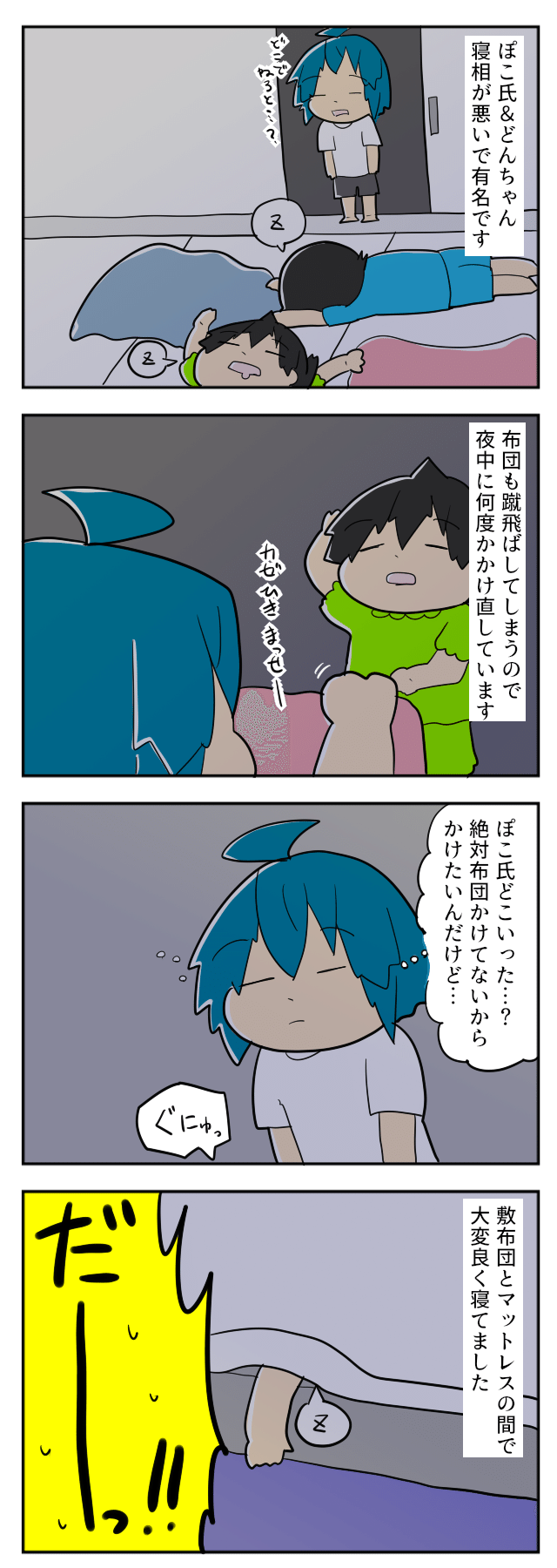 2016年生まれの兄ぽこちゃん、2018年生まれの妹どんちゃんのママであるmochikoさんから、寝相のお話です。寝相が悪いというぽこちゃんとどんちゃん。ある夜、mochikoさんが子ども達に布団をかけようとすると・・・。