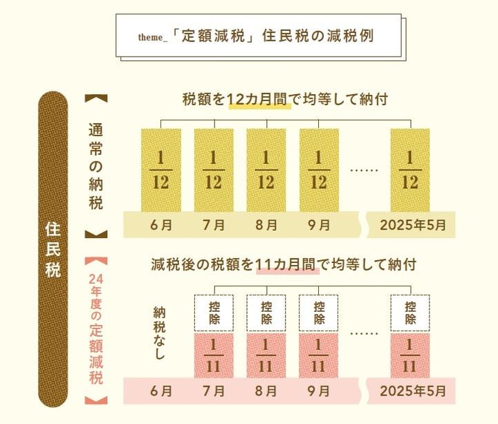 会社員の場合、2024年6月分は住民税の徴収がなく、7月以降、2025年5月までの11カ月間で、納税者本人と扶養家族分(1人当たり1万円)の減税分を均等して控除される形になります。