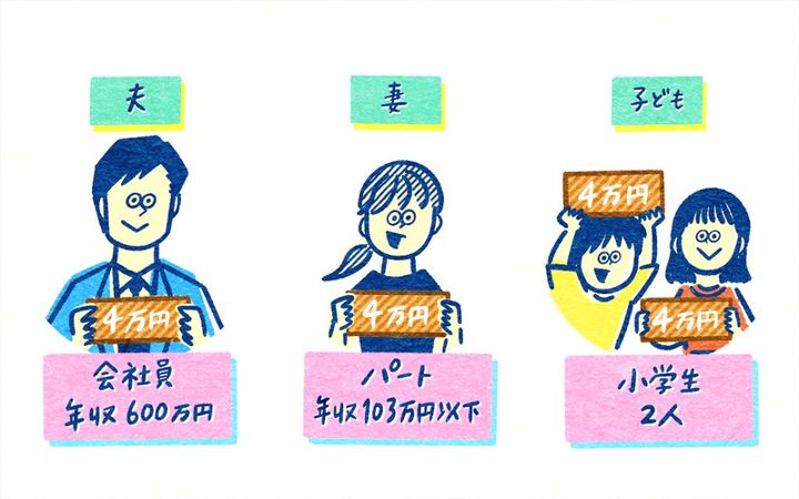納税者本人(夫)と扶養家族(妻、子ども2人)の4人家族の場合