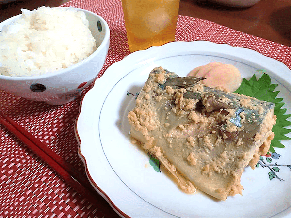 サバみそ煮ってみその主張が強いですが、こちらはみそと牛乳がうまく溶け合い、食べやすくなっています。家にあった新しょうがの酢漬けと相性抜群です。