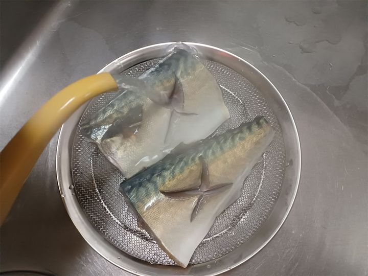 1.サバをさっと洗い水気を拭き取り、塩をまぶして血合いをこすり流し、サバの皮目に切り込みを入れ、熱湯をまんべんなくかけて臭みを取りをする。赤唐辛子は半分に切って種を除く。