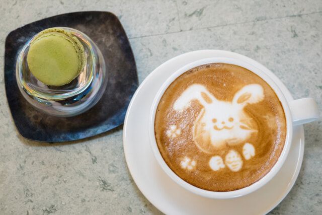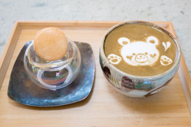 ホットのほうじ茶ラテには、その時々で絵柄がことなる可愛らしいラテアートが入ります。マカロンは山本の酒粕を使った「シラカミ」をチョイス。マカロンの甘さと酒粕の香り、ほうじ茶の香ばしさやキビ糖の優しい甘みを楽しむことができました。