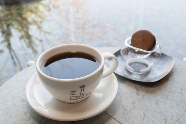 ブレンドコーヒーは、山本の酒造りで使われる辛口のセクスィー酵母と香りが華やかなゴージャス酵母の味わいに合わせ、ケニアとグァテマラをブレンドしたフルーティな酸味と爽やかな後味の「セクスィーブレンド」と、エチオピアとコロンビアの華やかな香りとコクの「ゴージャスブレンド」を日替わりで提供。マカロンはショコラアメール(ガナッシュショコラ)を選びました。コーヒーにも酒造りのこだわりを活かす面白い試みです。