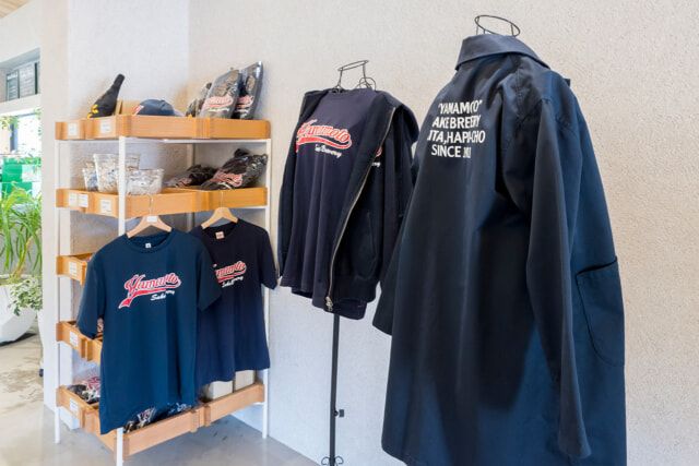店内にはグッズコーナーも用意。酒蔵で働くスタッフ着るTシャツや、ピュアブラックのグッズなど様々そろい、山本ファンには堪りません。