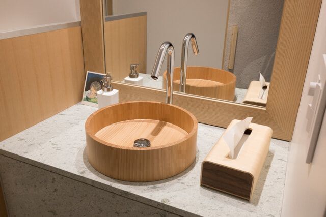 秋田杉を使った伝統工芸品「曲げわっぱ」やおひつ造りで知られる秋田県。トイレの洗面もおひつ職人の手によるもの。洗面台にも十和田石を使います。