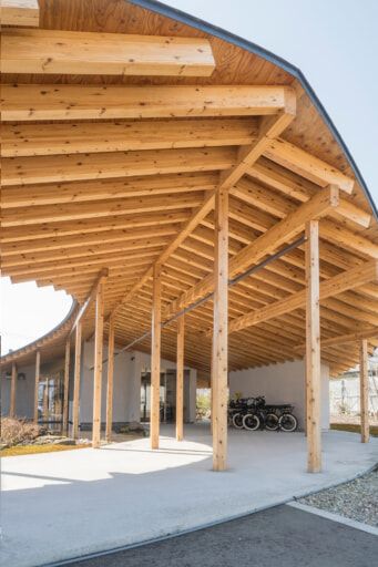 ▲秋田産の木材をふんだんに使った建物はS字の形をしています