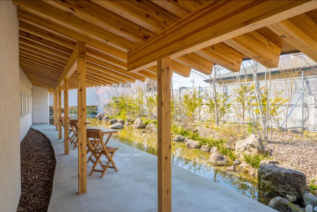 米と麹(こうじ)、そして水から作られる日本酒。カフェのまわりには3箇所の水盤が設けられ、そこには仕込み水でも使われる白神山地の湧き水が24時間掛け流されされてます。季節を感じる植物が植えられ、酒造りには欠かせない水を目にしながらひと時を過ごせます。