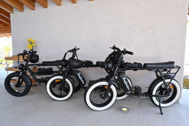 カフェではビンテージ風のお洒落な電動アシスト自転車「Buffalos(バッファローズ)」を1時間¥1,000円(免許不要)で借りられます。自転車で5分ほどの場所には白神山地の自然湧水の滝「白瀑(しらたき)」や、“みこしの滝浴び” で知られる白瀑(しらたき)神社があるなど、八峰町の周辺散策にも便利です。