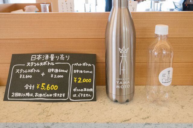 日本酒テイスティングセットで提供しているお酒は、量り売りもしています。600ml入るオリジナルのステンレスボトルはボトル代¥3,600とお酒¥2,000。500mlのペットボトルなら容器代不要で¥2,000で購入。お洒落な保冷バックも販売しています。