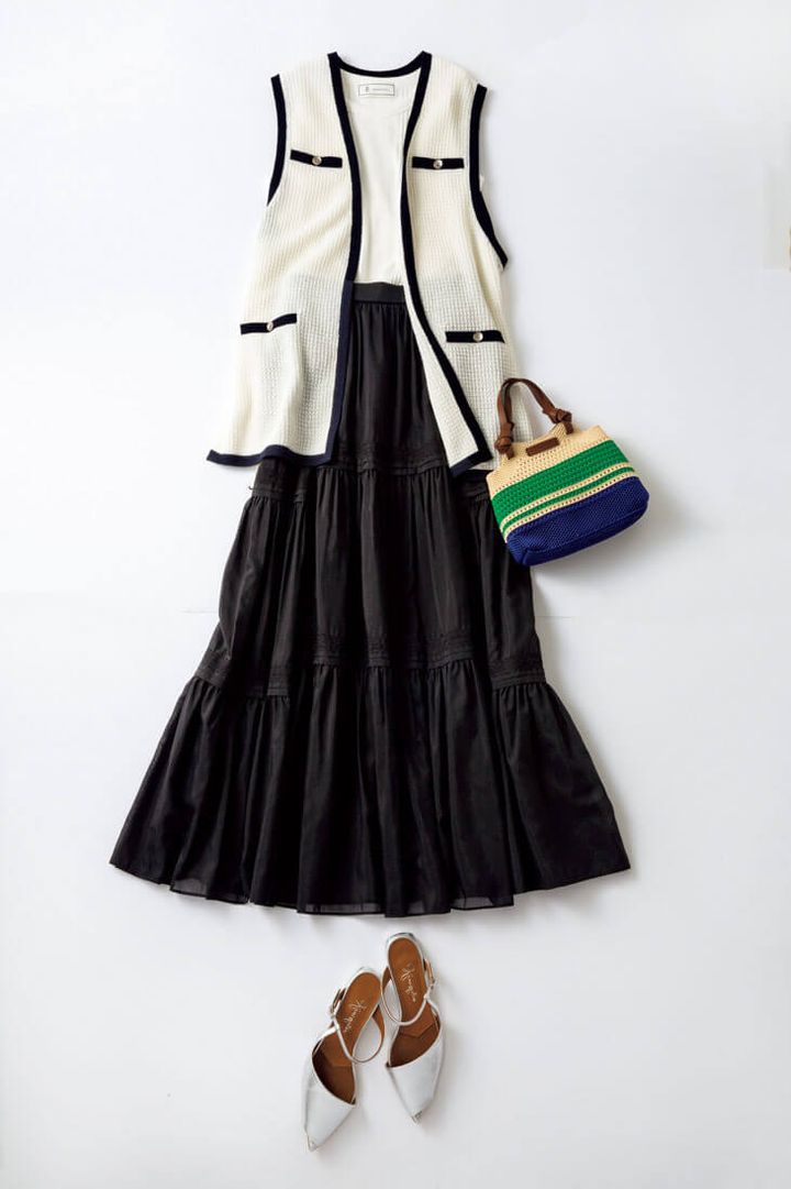 コットンなら黒ロンスカもライトな印象に。透け感のあるニットジレを合わせれば夏のモノトーンコーデが完成♪