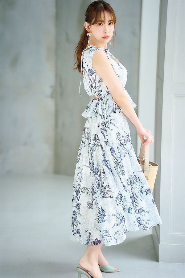 夏色のフラワーを一面に広げたバカンスムードなドレス。ほんのり透けるシアー素材と背中のカッティングが軽やかなアクセントに。女性らしいウエストのペプラムフリルやきゃしゃなリボンディテールも◎。