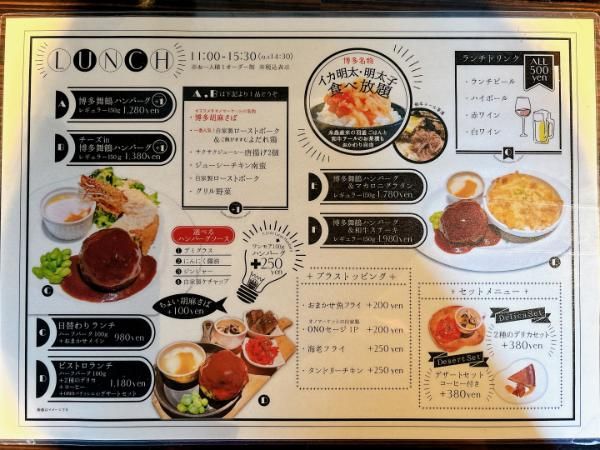 日替わりランチを注文すると、スタッフさんが手際良くサラダを盛り付け、手ごねしたハンバーグを焼いてくれます。 お料理が届くまでの間に、改めて店内メニュー表を眺めます。