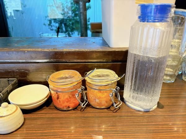 イカ明太、明太子はテーブルの上にある小皿を取って、自分で盛りたいだけ盛るスタイルです。 お冷は2杯目以降セルフです。