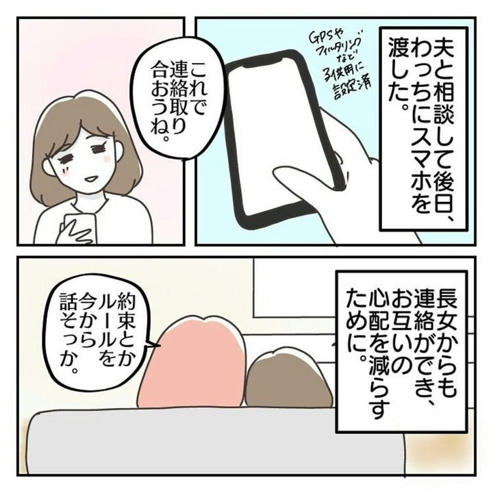 子どもだけでは判断が難しいときがあるかもしれません。ねこじまいもみさんは、わっちちゃんの行動範囲が広がったと感じたタイミングで、スマホを持たせることに決めました。これで、連絡を取り合うことができ、お互い安心ですよね。
