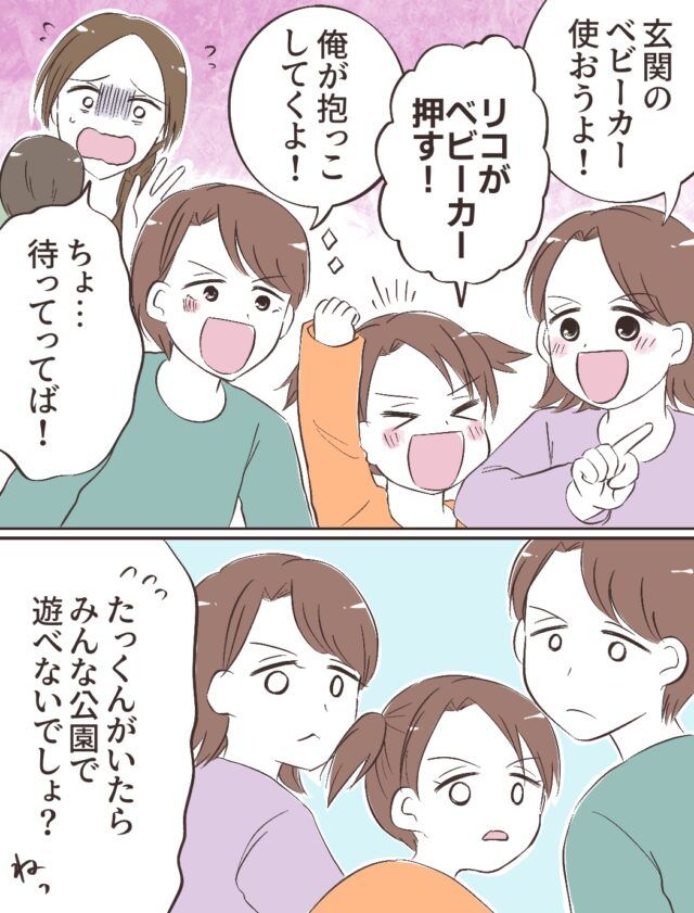たっくんを寝かしつけるとその場を逃げ出したご主人、結局寝つけず、遊びたい!と待ちわびていた子ども達に囲まれてしまい、「3人で公園でも行っておいで?」とマリコさんが言うと「それより3人でたっくんを公園に連れて行ったら?」と義姉が謎の提案を・・