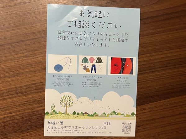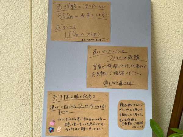 手書きのポップを読んでいると、ほんとうに些細な依頼でも受けてくださるのだと思いました。しかも喜んで受け付けてくれるので「子どものヘアゴムのほつれなんて依頼していいものかしら」「ボタンひとつなのだけど…」などの心配はご不要。