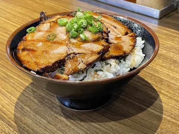 折角なので、ちゃあしゅうごはんも注文しました。 大ライスの分量で、内部は白米、サイコロ状のちゃあしゅう、白米の3層構造で、その上に刻んだ海苔、分厚い大判のちゃあしゅうが2枚。最後に刻みネギで彩が添えられています。 甘い特製タレを絡めると、最高のハーモニーが奏でられました。 これだけでも立派な主食です!