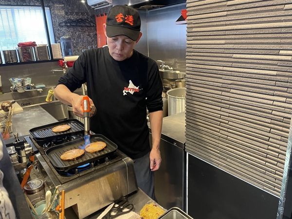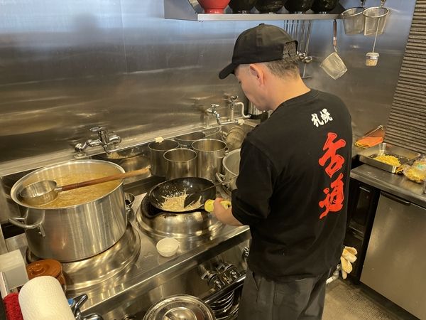 大将のスイッチON! 機能的に設計された厨房で、大将主演のショーが開演。豚ひき肉、ペースト状の玉ねぎ、にんにく、大量のもやしが、リズミカルに振られる中華鍋で踊っています。 麺茹でトッピング、すべて大将の無駄のない動きで完成させます。