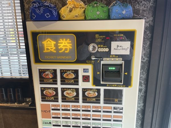 先ずは、食券購入から。券売機の前で悩んじゃいますが、 ①らぁめんの種類 × ②トッピング × ③ごはんも食べるか?に答えるだけ!! みそ、しお、しょうゆ、辛みそ、辛しおの5種類で、何を選ぶか迷います。今回は一番人気のみそらぁめんにコーンをトッピングしました。