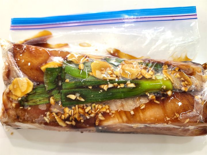1.  まずはチャーシューから作ります。にんにくを粗みじん切り、しょうがを薄切りにし、ジップ付き保存袋に入れ、しょうゆ、オイスターソース、砂糖、長ねぎの青い部分、ハイミーを加え煮汁を作っておきます。