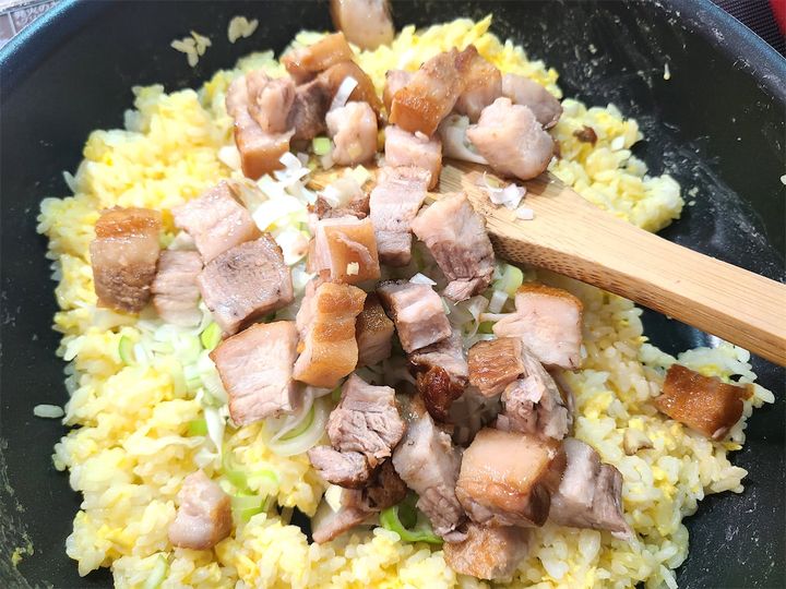 7.  長ねぎ、チャーシューを加えて炒め、塩、こしょう、ハイミーを加えさらに炒めます。