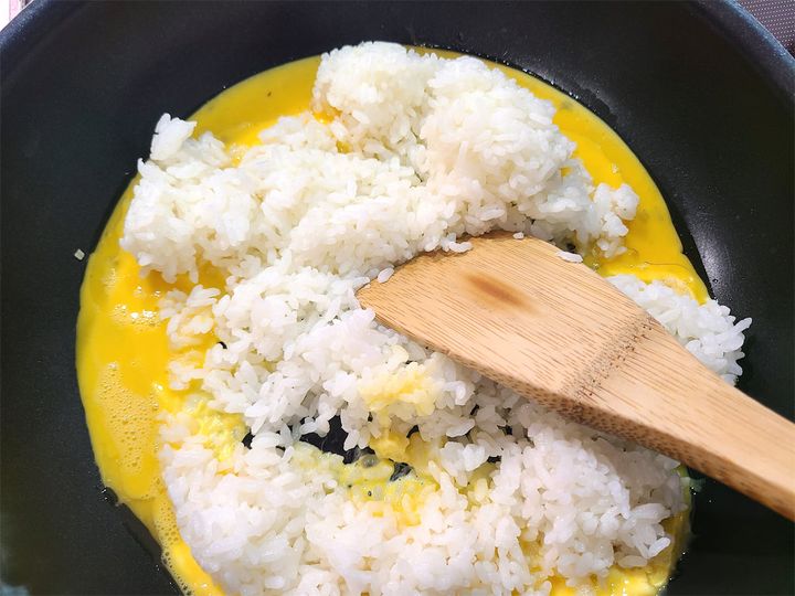 6.  いよいよ炒飯を作っていきます。しょうがと長ねぎを細かく刻み、フライパンに豚バラ肉を焼いたときに出た油を大さじ1程度引き中火で熱し、しょうがを炒めます。しょうががパチパチとしてきたら溶き卵を入れ、すぐにご飯を加えてしっかり炒め合わせます。