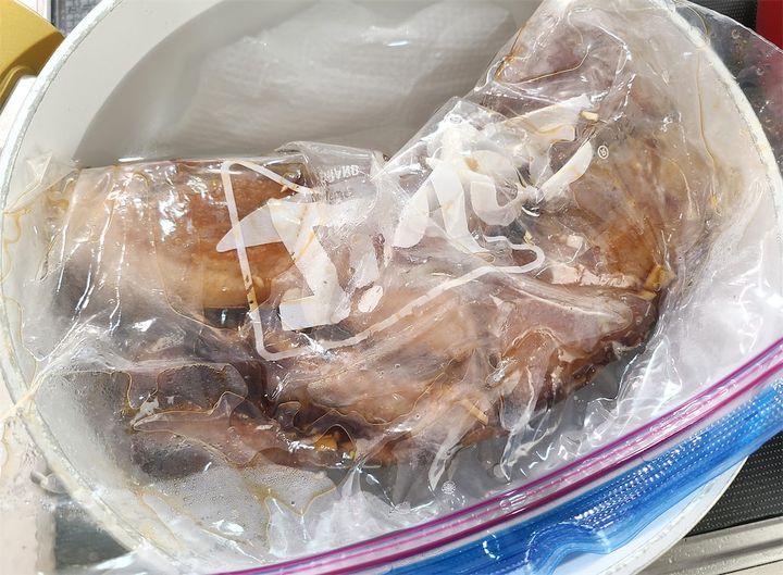 4.  お湯を沸かし、3のジッパーの口をしっかり締めて、フタをして弱火で1時間~1時間半茹でます。鍋底にキッチンペーパーなどを敷いて、直接鍋底にジッパー付き保存袋があたらないようにしましょう。
