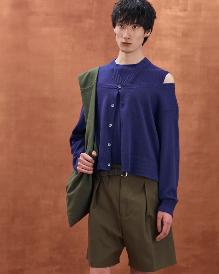ボタンダウンシャツのネックラインには三角形の「ポケット」が配され、襟をタックインできるユニークな工夫が仕掛けられている。こういった実験的なアプローチも、さりげないからこそうまく機能しているのだろう。