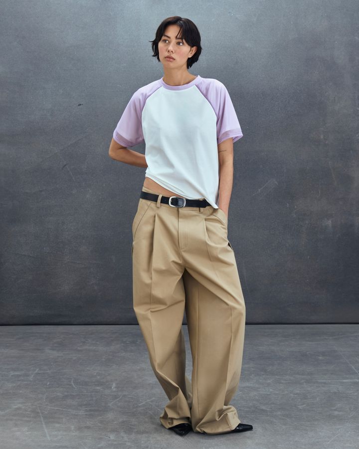 二人は現在、年に一度というスローペースでコレクションを発表している。しかし、3作目となる2025年春夏コレクションでは、ベースボールTシャツのスリーブに繊細なシースルージャージーを重ねたり、ジップアップパーカセットアップにはボールガウンに使われるコットンとナイロンのフェイル素材を使ったりと、デザインの幅を大きく広げたようだ。