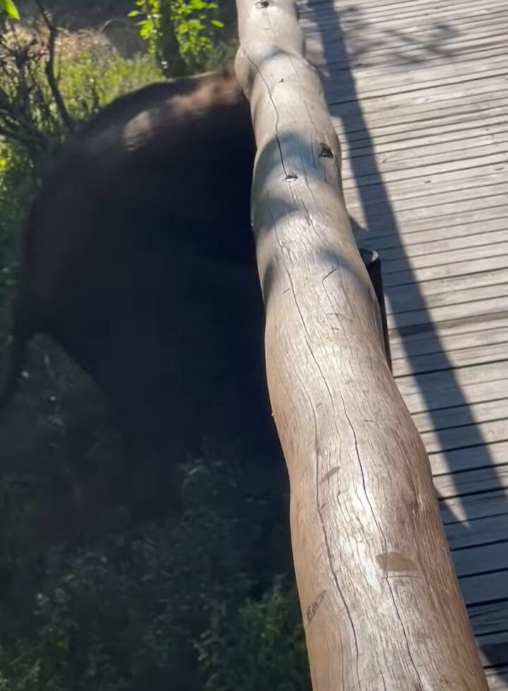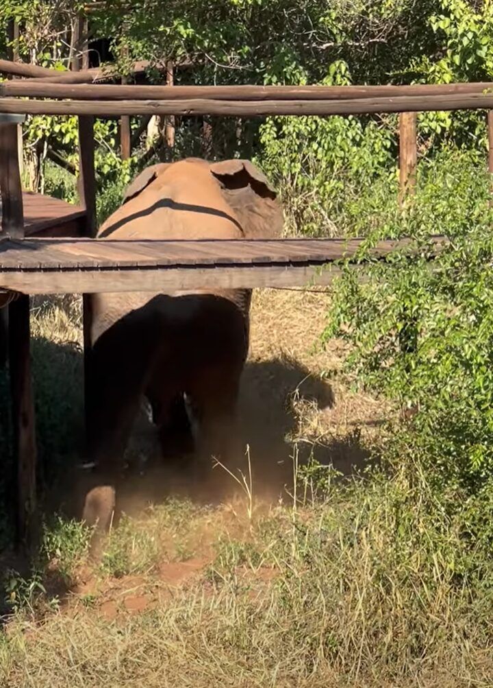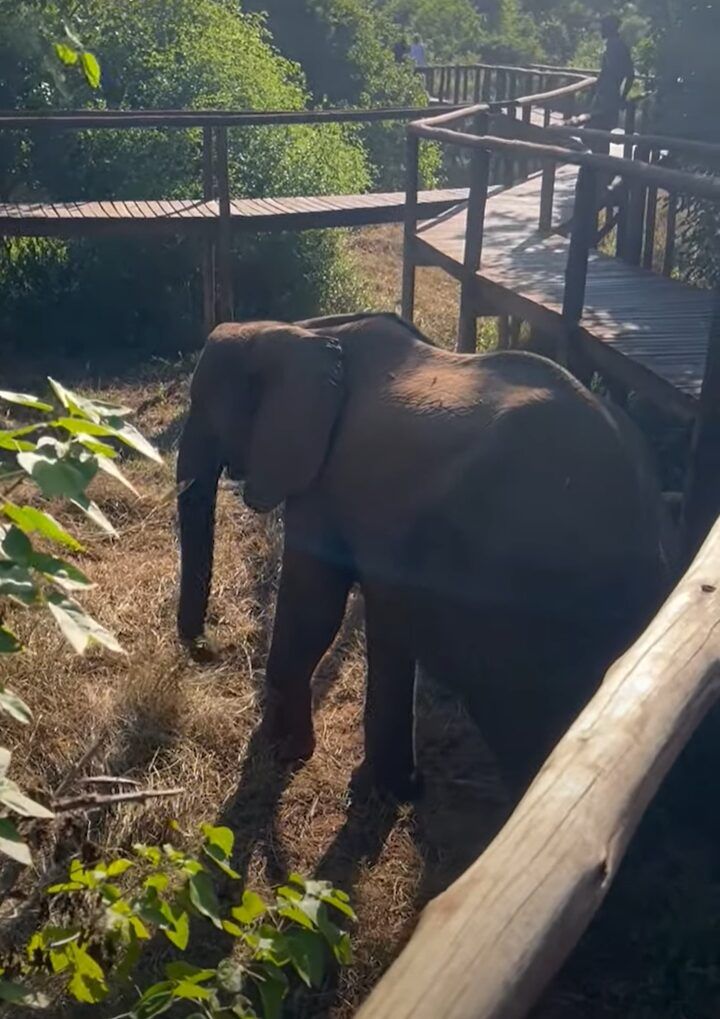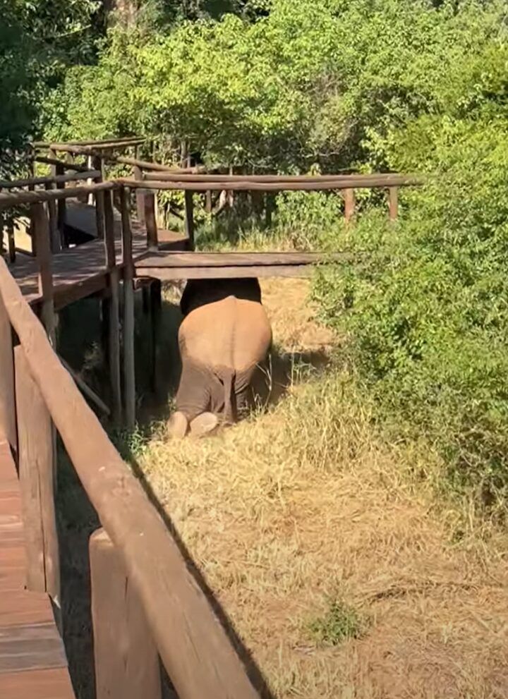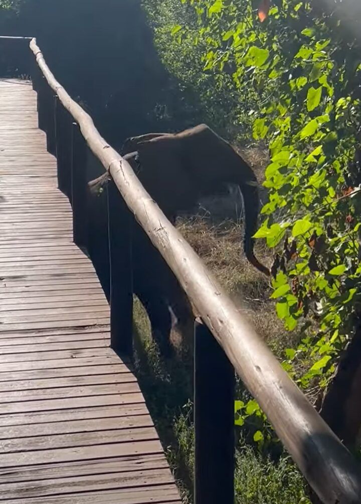 ロッジには、木製の橋が歩道として設置されています。 その歩道の下をちょうどくぐろうとしている体の大きなゾウの姿が!
