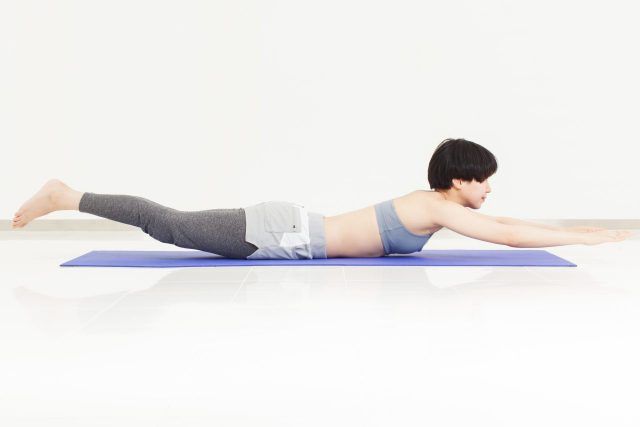 (1)うつ伏せになり、両腕を真っ直ぐ上に伸ばし、両脚を床から少し浮かす