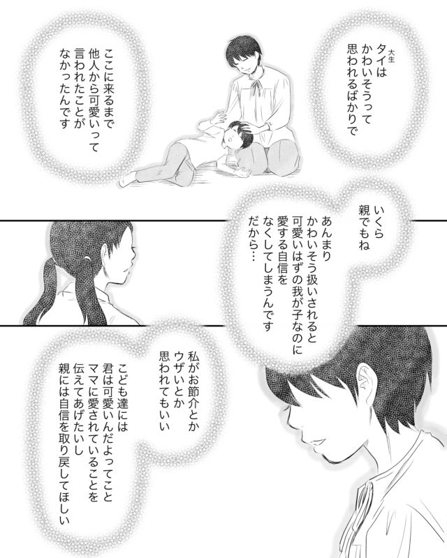 「まりこ先生、タイはかわいそうって思われるばかりで、ここに来るまで他人から可愛いって言われたことがなかったんです。
