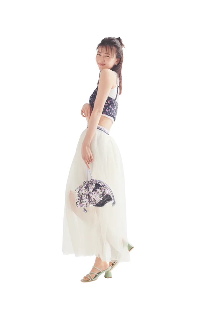 ビスチェは着回し。タンクトップ(ショートパンツつき)14,300円/Darich(YSM) チュールスカート 12,100円/CALNAMUR ピアス 1,980円/GOLDY バッグ 7,700円/キャセリーニ サンダル 2,450円/神戸レタス