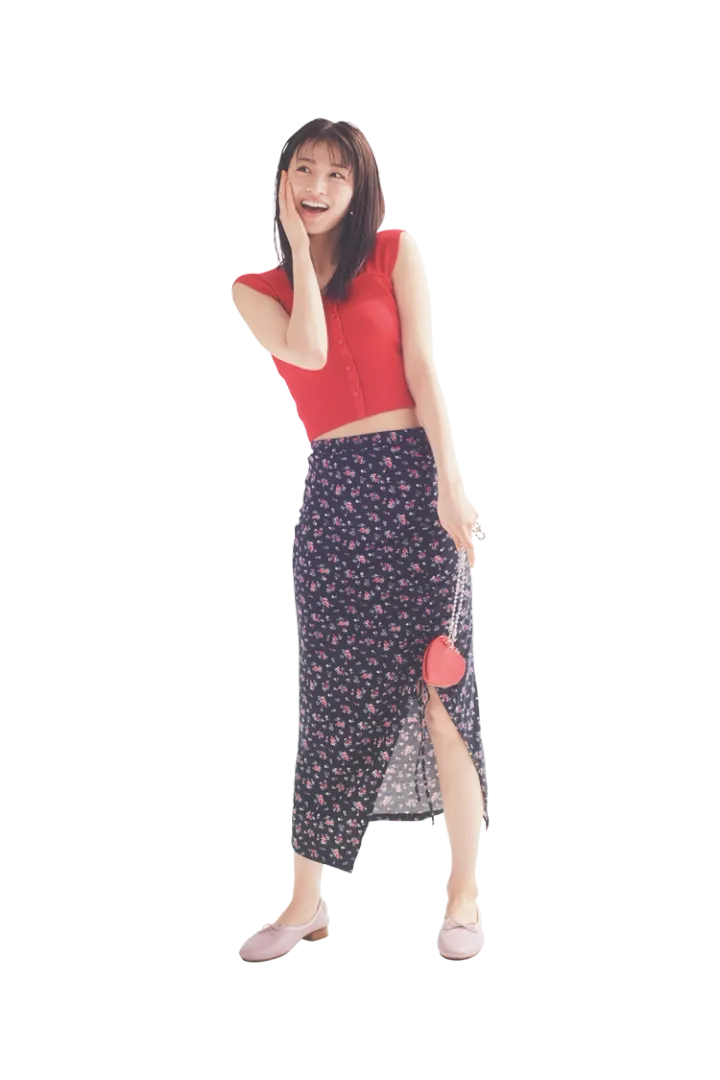スカートは着回し。赤タンクトップ 6,380円/MERCURYDUO ルミネエスト新宿店 ピアス 1,980円/GOLDY バッグ 3,289円/ROPÉ PICNIC PASSAGE(ジュン) バレーシューズ 17,050円/moumoune