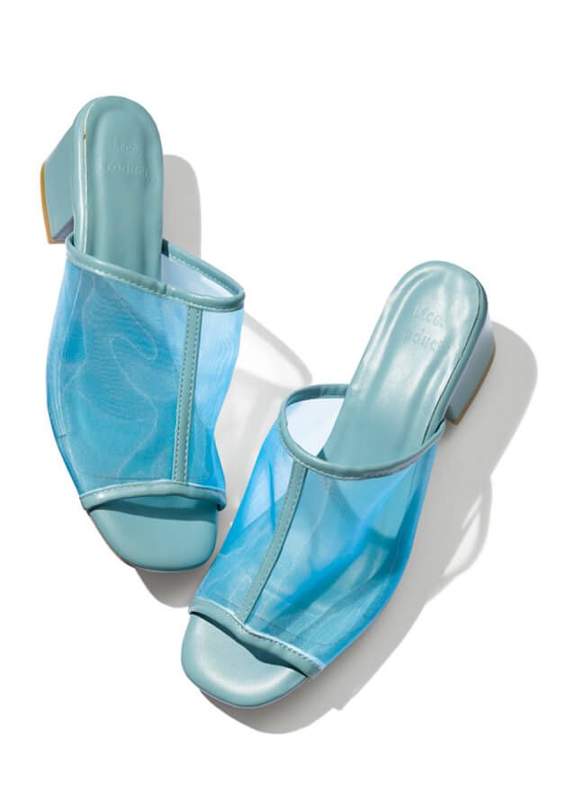素足がほんのり透けるブルーメッシュで、きりりと爽やかに。すっぽりと甲を包み込むデザイン&スクエアヒールが歩きやすさも保証済み。