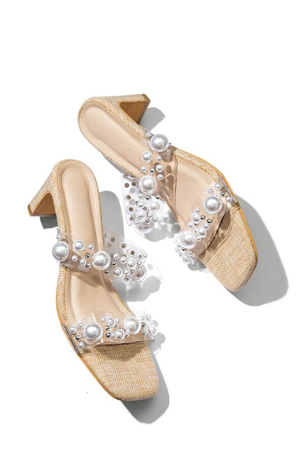 雑材素材×QVCの季節感あふれるコンビネーション。たっぷりとデコレートした粒違いのパール&ビジューでロマンティックな足元に。