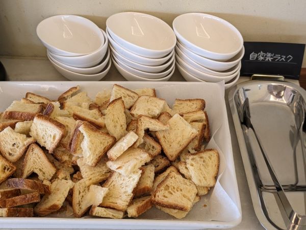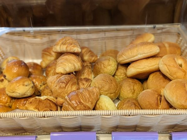 そして小さめのパンもご覧の通り。この日はレーズンパン、ミニクロワッサン、バジルフォカッチャ、ベーコンチーズでした。全部で7種類あり、日替わりもしくは、同日にローテーションで提供されています。因みに前回は、かぼちゃあんパンもありましたよ。