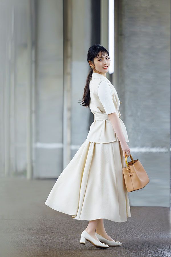 ジレセットアップ×ローヒールパンプスでロイヤルレディに