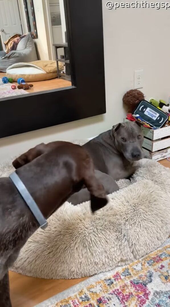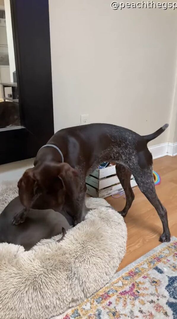 ベッドで眠ろうとしているみたいなのですが、ベッドには既に眠っている先客の姿がありました。 子犬は、この先客を起こさないようにしようと気を使っているようです。