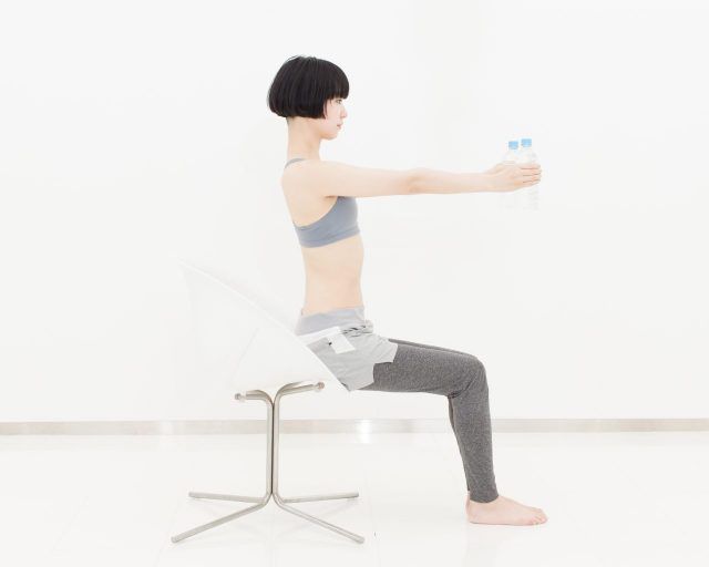 (1)水の入った500mlサイズのペットボトルを両手に持ち、背筋を伸ばして浅く椅子に腰掛ける