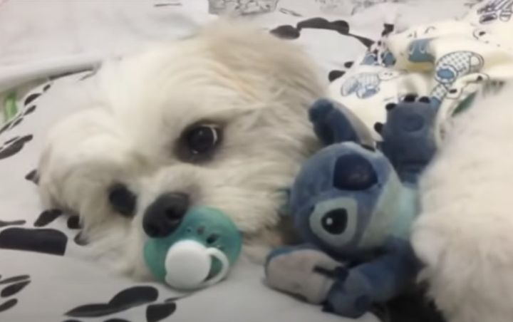 3. 赤ちゃんになってる♡ おしゃぶりを気に入った犬さん。
