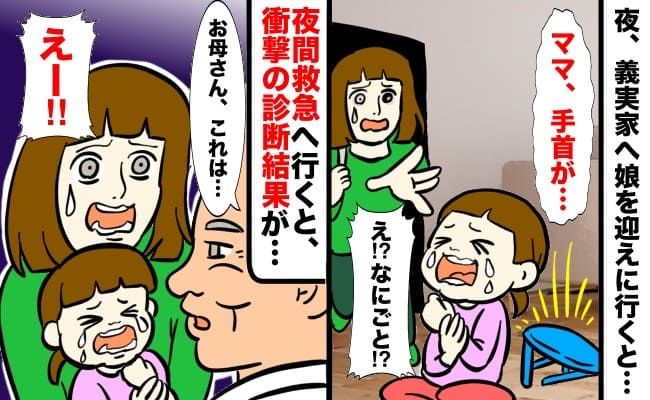 「なにごと!?」夜、義実家で手首を押さえ泣き喚く娘にギョッ!→夜間救急で衝撃の診断結果が下され…