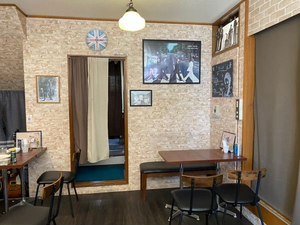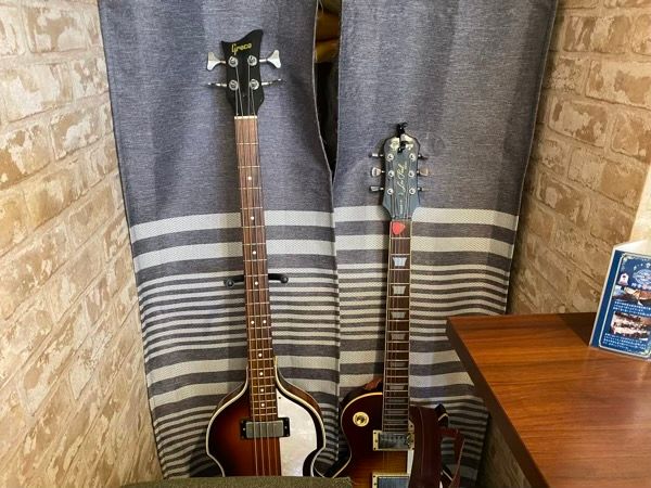 お店に入ると、まずビートルズのポースターやギターの展示が目に飛び込んできました! きっと店長さんは音楽好きなのでしょう。 ギターを間近で見る機会なんてなかなかないので、面白かったです。