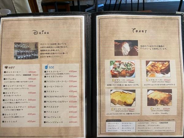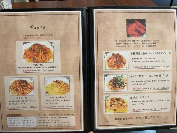 メニューを開くと、コーヒーはもちろん、トーストやパスタ、デザートのメニューもあり、目移りしてしまいます! ピザトーストやシナモントーストも気になりましたが、ランチなのでがっつりパスタでいこうと思い、トマトソースパスタの セットメニューをオーダーしました。