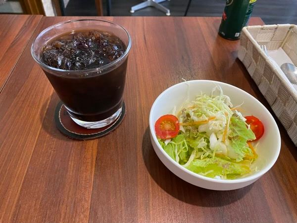 ついにオーダーしたメニューが到着しました。 まずは、コーヒーとサラダです。アイスコーヒーを飲むと、「おいしー!」と思わず言葉が出ていまいそうでした。 外が暑かったこともあり、アイスコーヒーが美味しい季節になりました。