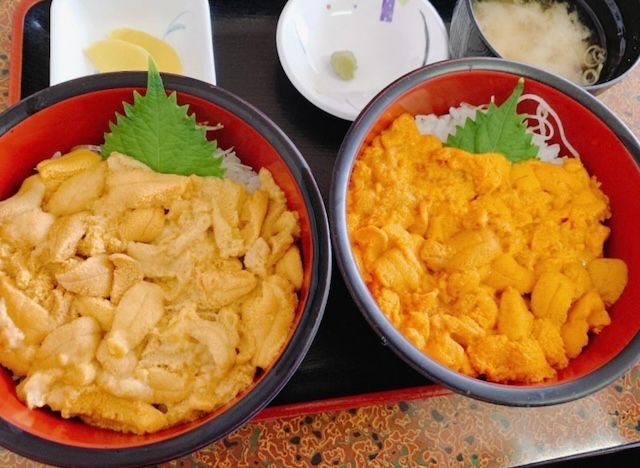 店内は広く、食券を購入してから5分ほどでウニ丼が運ばれてきます。ここで提供されるのは主に白ウニ(キタムラサキウニ)と、希少な赤ウニ(エゾバフンウニ)。どちらの丼も頼んで色を比べてみました。色の濃い赤ウニは北海道や東北でしか獲れず、積丹での漁獲量も少ないため希少価値が高いです。