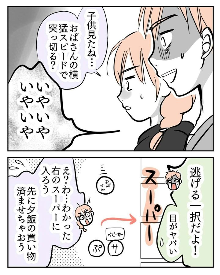 この日初めて、ハイタッチおばさんに遭遇した夫。会った瞬間「目がヤバい」と感じ、咄嗟にスーパーへと駆け込みました。