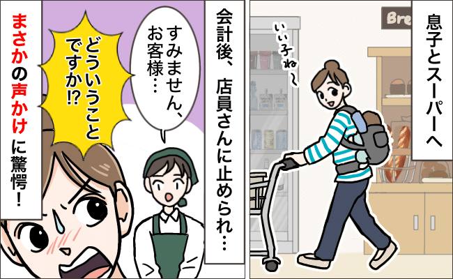 限られた時間の中、あれもこれもとカートに入れ、メモを見ながら買い漏れが無いか見ながら店内を進みました。10キロの米まで買い、やっとの思いでいざレジへ行きました。会計を済ませて、荷物を入れていると、店員さんに「すみません、お会計の済んでいないものがありますよね。」と言われました「こんなに大変な思いをして、やっと買い物をしているのに……とイライラしてしまい、「どういうことですか?」と半ギレ気味に聞いてしまいました。